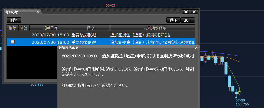 FXトレードにおいて証拠金不足で追証が発生し、結果として18時ちょうどに全ポジションを強制決済されてしまうということが発生しました。